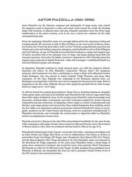 25 tangos by the revolutionary tango musician and composer Astor Piazzolla, arranged for cello and piano. These crowd-pleasing tangos borrow from classical, jazz, and Latin traditions. Includes Piazzolla's most famous tangos “Libertango” and “Oblivion.” Appropriate for the intermediate to early advanced player. Includes separate pull-out cello part.