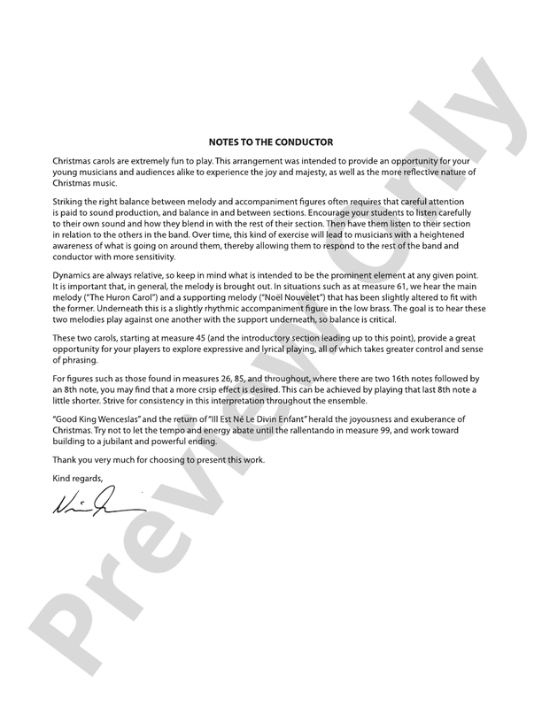 Get ready for an abundance of merriment! This work features carols that have been traditionally sung in Canada for many years and will help to create a spirit of mirth in no time. It opens with the joyous strains of "Il Est Né Le Divin Enfant (He is Born, The Divine Child)" and continues with the plaintive and modal "Noël Nouvelet (Sing We Now of Christmas)." "The Huron Carol ('Twas In the Moon of Wintertime)" is then presented with remnants of "Noël Nouvelet" cleverly woven in. The dramatic conclusion develops brief dialogue between "Good King Wenceslas" and "Il Est Né Le Divin Enfant" that brings the work to an exuberant and powerful close. Juxtaposing the lyrical and expressive with the joyous and cheerful in this masterful arrangement will add a little touch of Canada to your next holiday concert.