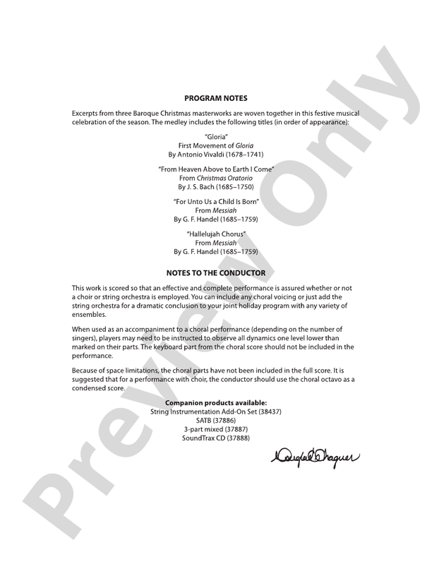 A cherished holiday medley containing three Baroque holiday masterworks woven together in this festive musical celebration of the season. Building on the work of Vivaldi, Bach, and Handel, Douglas Wagner's arrangement has been scored to work alone as a concert band work, or to include a variety of choral voicings and/or the optional string orchestra set. A dramatic holiday program work to showcase your entire music department! (4:30)