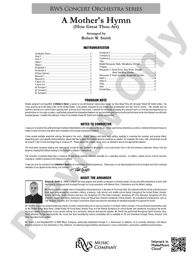 Simple, poignant and beautiful, "A Mother's Hymn" by Robert W. Smith is an artistic experience for both full orchestra and audience. Based on an old Swedish melody also known as "How Great Thou Art," this setting is appropriate for any concert or festival performance. An instant standard in the orchestra repertoire.