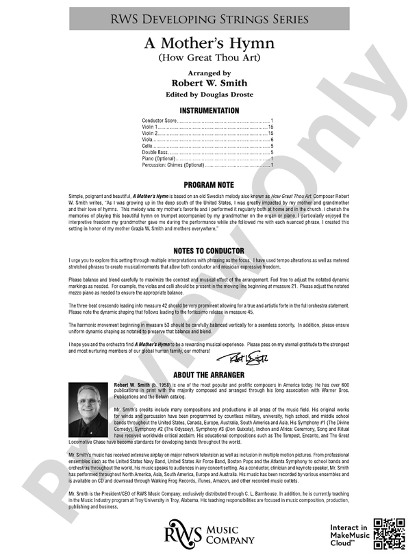 Simple, poignant and beautiful, A Mother's Hymn by Robert W. Smith creates an artistic experience for both string orchestra and audience. Based on an old Swedish melody also known as How Great Thou Art, this setting is appropriate for any concert or festival performance. An instant standard in the orchestra repertoire.