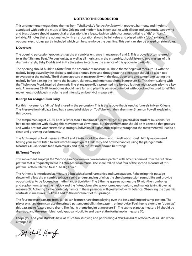 Tchaikovsky strolls the streets of the French Quarter! Arranger Michael Kamuf reimagines the "Overture," "Dance of the Sugar Plum Fairies," and "Trepak" themes by using different New Orleans-based grooves, rich jazz harmony, and plenty of syncopation and rhythmic twists. Students will love playing these themes, and your audience will dance in the aisles! *A New Orleans Nutcracker Suite* is the perfect addition to your holiday program. Though written as a suite, each movement can stand alone. (6:00)