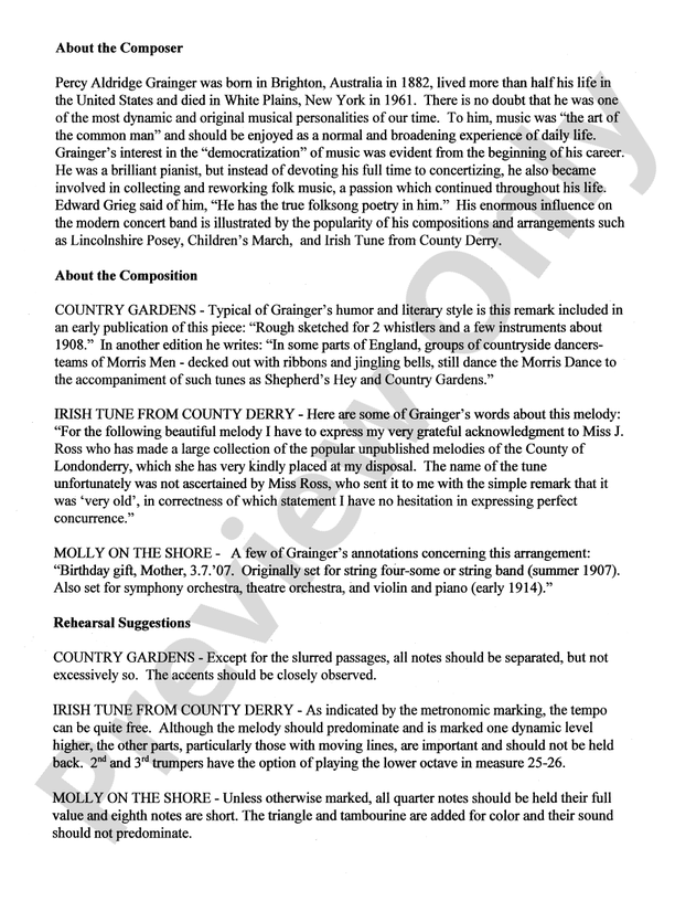 *Country Gardens* is typical of Grainger's humor and literary style where as the *Irish Tune from County Derry* Grainger expresses his grateful acknowledgment to Miss J. Ross who has made a large collection of the popular unpublished melodies of the Country of Londonderry, which she has very kindly placed at his disposal. *Molly on the Shore* was originally set for strings four-some or string band (summer 1907), also set for symphony orchestra, theater orchestra, violin and piano (early 1914).