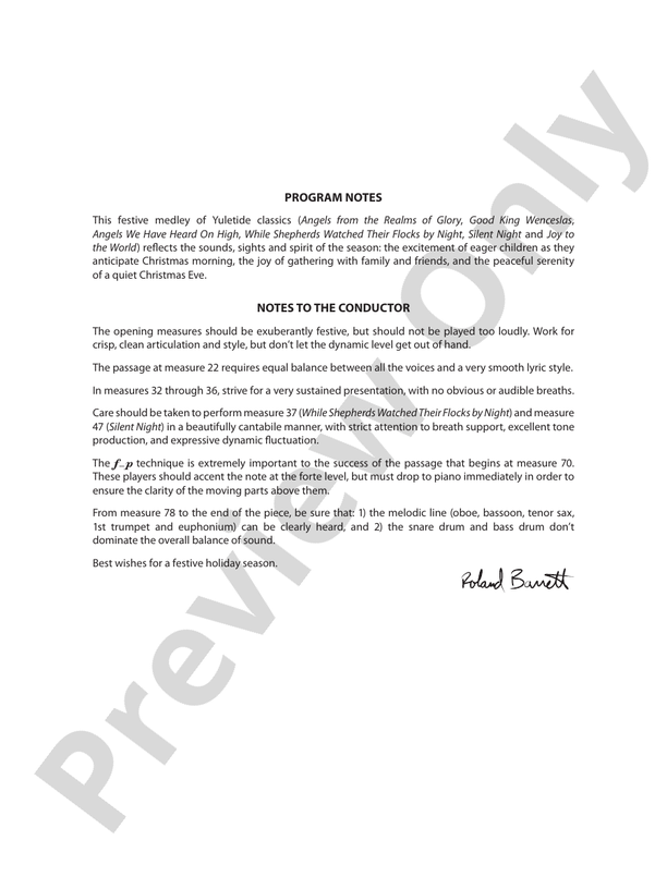 This festive medley of Yuletide classics ("Angels From The Realms Of Glory," "Good King Wenceslas," "Angels We Have Heard On High," "While Shepherds Watched Flocks By Night," "Silent Night," and "Joy To The World") reflects the sounds, sights, and spirit of the season: the excitement of eager children as they anticipate Christmas morning, the joy of gathering with family and friends, and the peaceful serenity of a quiet Christmas Eve. A most musical collection of cherished holiday tunes certain to brighten your holiday concert and boost everyone's spirit at this very special time of the year.