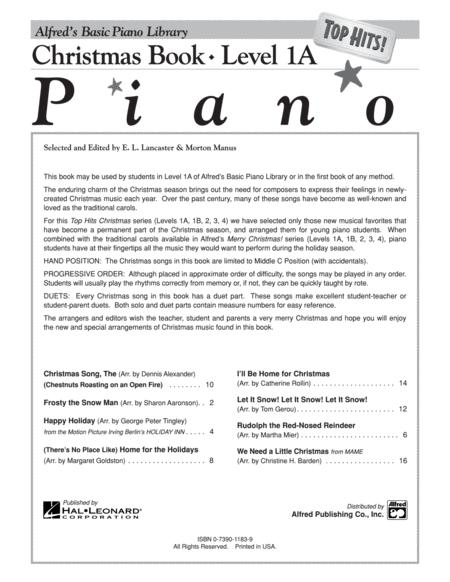 This book may be used by students in Level 1A or the Complete Level 1 of Alfred's Basic Piano Library or in the first or second book of any method. Titles: The Christmas Song * Frosty the Snowman * Happy Holiday * (There's No Place Like) Home for the Holidays * I'll Be Home for Christmas* Let It Snow! Let It Snow! Let It Snow! * Rudolph, the Red-Nosed Reindeer * We Need a Little Christmas.