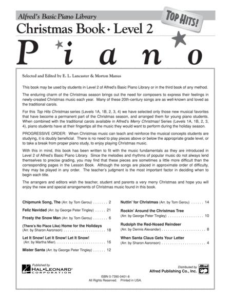 These piano arrangements may be used by students in Level 2 of Alfred's Basic Piano Library or in the second book of any method. Titles: Feliz Navidad * Frosty the Snow Man * Home for the Holidays * Let It Snow! Let It Snow! Let It Snow! * Mister Santa * Nuttin' for Christmas * Rockin' Around the Christmas Tree * Rudolph the Red-Nosed Reindeer * The ChipmunkSong * When Santa Claus Gets Your Letter.