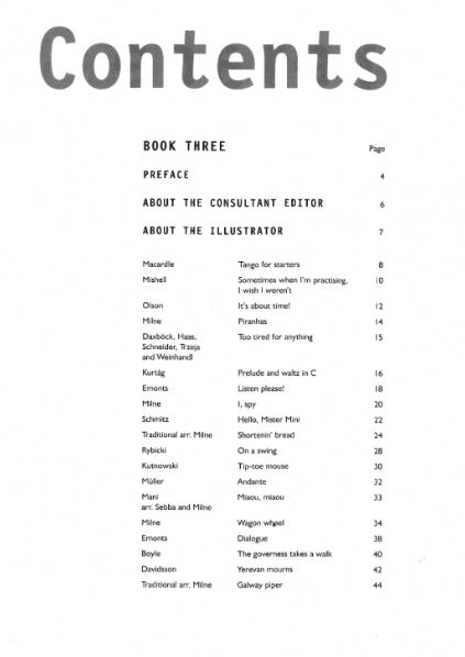 + Tango for starers (Macardle) + Sometimes when I'm practising, I wish I weren't (Mishell) + It's about time! (Olson) + Piranhas (Milne) + Too tired for anything (Daxböck, Hass, Schneider, Trzeja and Weinhandl) + Prelude and waltz in C (Kurtág) + Listen, please! (Emonts) + I, spy (Milne) + Hello, Mister Mini (Schmitz) + Shortenin' bread (Traditional arr. Milne) + On a swing (Rybicki) + Tip-toe mouse (Kutnowski) + Andante (Müller) + Miaou, miaou (Mani arr. Sebba and Milne) + Wagon wheel (Milne) + (Emonts) + The governess takes a walk (Boyle) + Yerevan mourns (Davidsson) + Galway piper (Traditional arr. Milne)