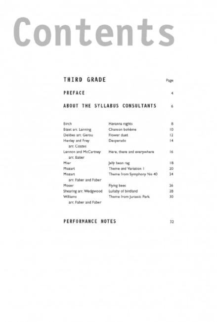 + Havanna nights (Birch) + Chanson bohème (Bizet arr. Lanning) + Flower duet (Delibes arr. Gerou) + Desperado (Henley and Frey arr. Coates) + Here, there and everywhere (Lennon and McCartney arr. Baker) + Jelly bean rag (Mier) + Theme and Variation I (Mozart) + Theme from Symphony No 4 (Mozart arr. Faber and Faber) + Flying bees (Moser) + Lullaby of birdland (Shearing arr. Wedgwood) + Theme from Jurassic Park (Williams arr. Faber and Faber)