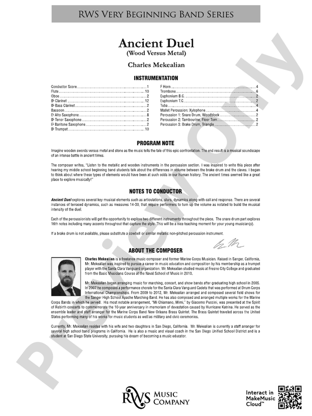 Prepare for musical combat! The competitors? Metal instruments vs. wooden instruments. Sounds of wooden swords battling metal and stone set the scene of an epic battle. The contrasting musical elements work together to create a musical melee that draws the audience into the fray. Call and response sections provide a fun and exciting method for reinforcing rhythmic accuracy and tempo discipline.