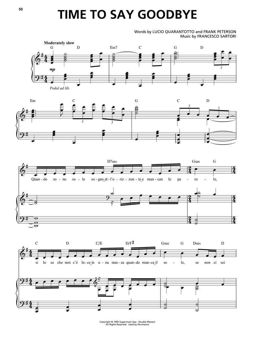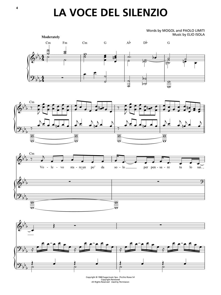The first greatest hits album from this popular Italian tenor features 16 of his most popular songs, and our songbook features vocal transcriptions with piano accompaniment for 15 of those tracks: A Te • Because We Believe • Bésame Mucho • Canto Della Terra • Con Te Partiro • Il Mare Calmo Della Sera • Io Ci Saro' • La Voce Del Silenzio • Melodramma • The Prayer • Romanza • Sogno • Time to Say Goodbye • Vivere • Vivo Per Lei.