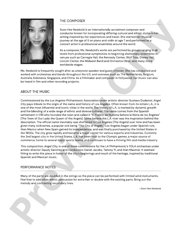 Explore the Spanish and Mexican origins of Los Angeles with this incredible work for full orchestra by Soon Hee Newbold. Passion, drama, and excitement all combine in *Angel City,* a mature sounding piece that is also accessible to less advanced groups. A separate version is available for strings alone, making this even more accessible. (4:00)