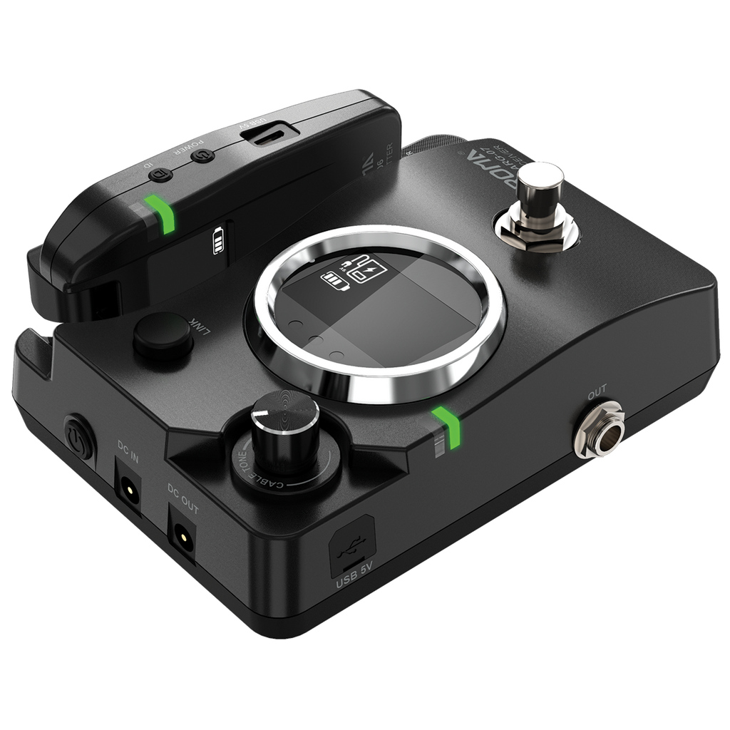 Transmitter and receiver have built-in large capacity rechargeable battery; and the receiver has DC 9V OUT for charging effect pedals.