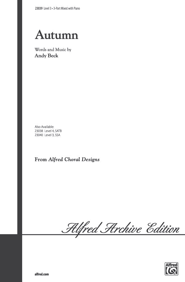 Here is a stunning choral work inspired by the beauty of an autumn day. A lyric melody, lush harmonies, and a poetic text are combined with a sensitive piano accompaniment to paint a colorful musical picture. You can almost see the leaves take flight when your choir sings the melodic refrain, and you will get a true sense of foliage falling layer upon layer as the second verse begins to echo and overlap. An expressive choral piece for concert and contest.