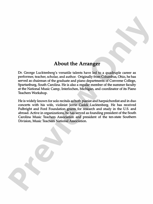 Selections from the pages of the "Notebook for Anna Magdalena Bach" have been arranged here by George Lucktenberg, in collaboration with David Carr Glover, to be played by 4 intermediate level performers. It is also possible for perform these pieces using 2 performers, each reading both parts on a page. These pieces have been altered from the originals as little as possible. Two copies are required for performance. Includes: Musette * Minuet in G * Minuet in G Minor * Minuet in G * Minuet in A Minor * Minuet in C Minor * Polonaise. For two pianos, eight hands. A Federation Festivals 2024-2028 selection.