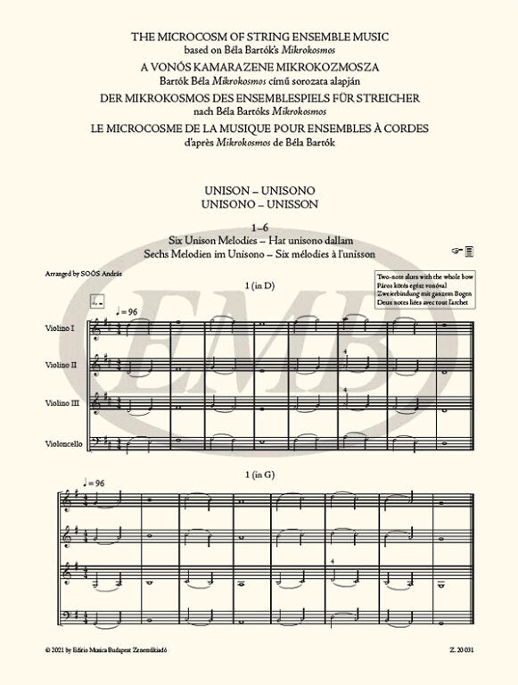 Mikrokosmos is perhaps the 20th century's most influential set of piano pieces and one of the milestones in pedagogical piano repertoire. These 153 piano pieces, organized in ascending order of difficulty, engage not only with technical aspects of piano playing but also with the fundamentals of composition. In addition, they include character pieces and even pieces with programmatic ideas. The Microcosm of String Ensemble Music provides 148 transcriptions from this series for making music for various string ensembles and graded in four volumes according to level of difficulty. Volumes 1 to 3 also include one copy of each part in addition to the full score. For performances with orchestra, further printed parts can be ordered individually. The parts are also available online at www.digikotta.hu, where they can be viewed and downloaded for free as A4 PDF files using the individual code printed in the volumes.
