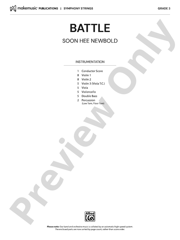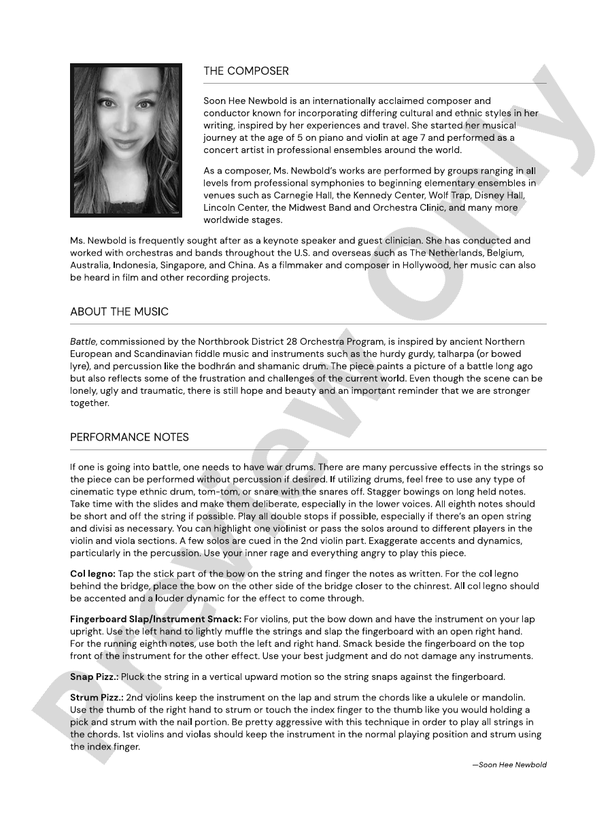 Inspired by ancient Northern European and Scandinavian fiddle music, Battle paints a picture of war long ago while also reflecting on the frustration and challenges of the current world. Soon Hee Newbold uses a wealth of exciting string effects, including col legno, fingerboard slaps, snap pizzicato, and more. Optional percussion helps create an amazing sonic landscape! (4:40)