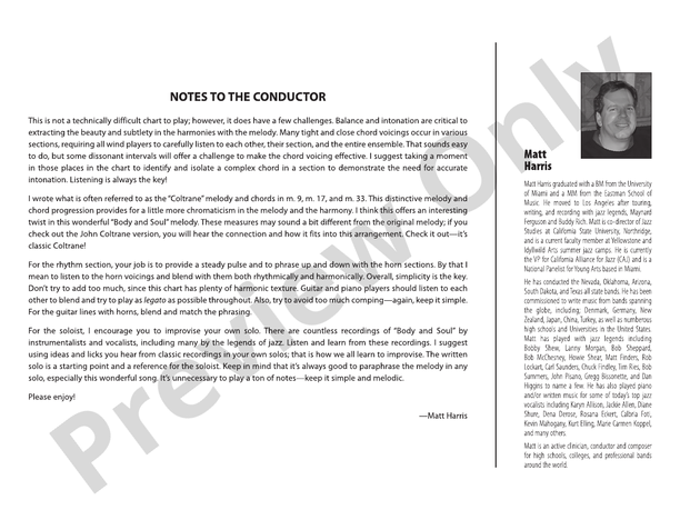 "Body and Soul" is a great jazz standard. An ideal tenor sax ballad feature, the tempo is 98 BPM, and the tenor has the melody and a written-out improv solo. It's lush, with a nice texture with flugelhorns, and the lead trumpet range is to written G on top of the staff. (3:33)