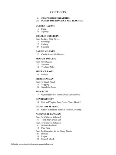 This five volume series, at five levels of difficulty, compiles carefully selected music for piano students by various French composers, much of which will be new to many teachers, allowing for fresh discoveries. Each volume is in progressive order, and includes composer biographies. “Points for Practice and Teaching” illuminate special issues for the student, and can be used as a lesson plan for the teacher for teaching a piece.,,Contents:,OLIVIER HAURAY: Franz, Mystery • CHARLES KOECHLIN: Greetings, Lullaby, Siciliana • DARIUS MILHAUD: Candy • FRANCIS POULENC: Staccato, Tyrolean Waltz • MAURICE RAVEL: Prélude • PIERRE SANCAN: Skipping, Sound the Drum • ERIK SATIE: Gymnopédie No. 1 • HENRI SAUGUET: Paul and Virginia • DÉODAT DE SÉVERAC: Games in the Park • ALEXANDRE TANSMAN: Difficult Problem, Dreams, The Little Cartoon Cat, Ping Pong, Prayer, Spanish Mood