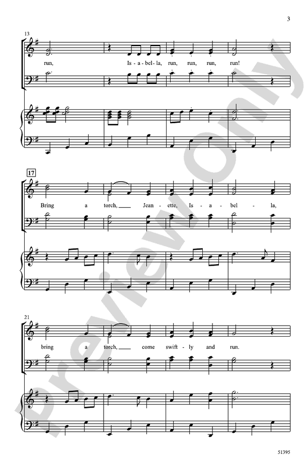 This energized arrangement of the traditional French carol radiates excitement. Original material winds its way between the charming verses, encouraging Jeanette and Isabella to "run, run, run" to Bethlehem. Those familiar melodic "ah's" garner anticipation, and a buoyant flute obbligato (available as a free download) amplifies the urgency.