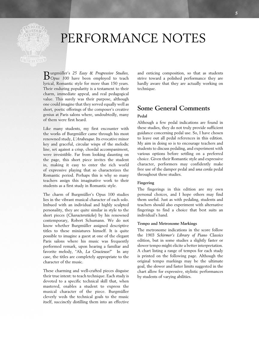 Pedagogical in nature, these editions offer insightful interpretive suggestions, pertinent fingering, and historical and stylistic commentary. Johann Friedrich Burgm¨ller (1806-1874) was born into a German musical family; both his father and brother were also well-known composers. Settling in Paris after 1832, his light and intimate playing style won popularity in the salons of the day. Originally titled 25 Études faciles et progressives, composées et doigtées expressément pour l'entendue des petites mains, his Opus 100 pieces are perennial favorites among piano students and their teachers.