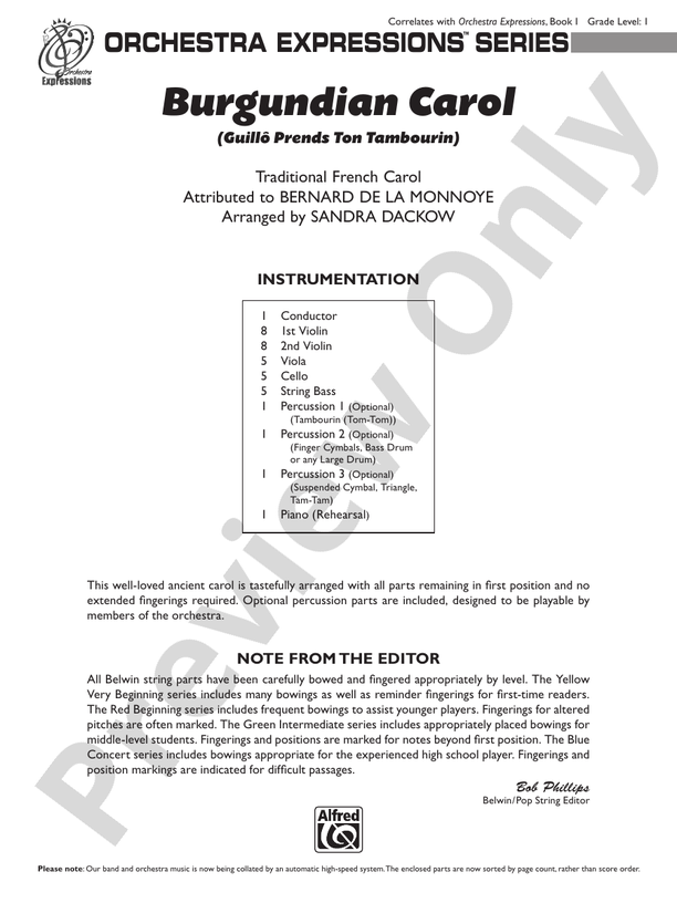 Composer: Bernard de la Monnoye Arranger: Sandra Dackow Instrumentation: String Orchestra Grade: 1 Publisher: Alfred Music Series: Orchestra Expressions Format: Digital PDF