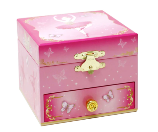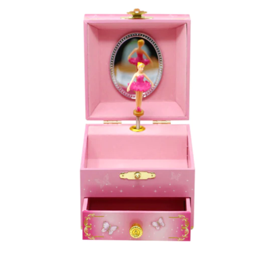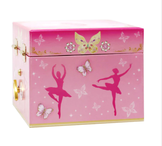 Butterfly Ballet Small Musical Jewellery Box is a gorgeous keepsake portraying beautiful illustrations of ballerina and butterflies dancing in the sweet pink background sky. It features an oval mirror and a flocked interior. The wind-up design plays the classic tune 'Swan Lake' whilst the Ballerina figurine twirls delightfully.