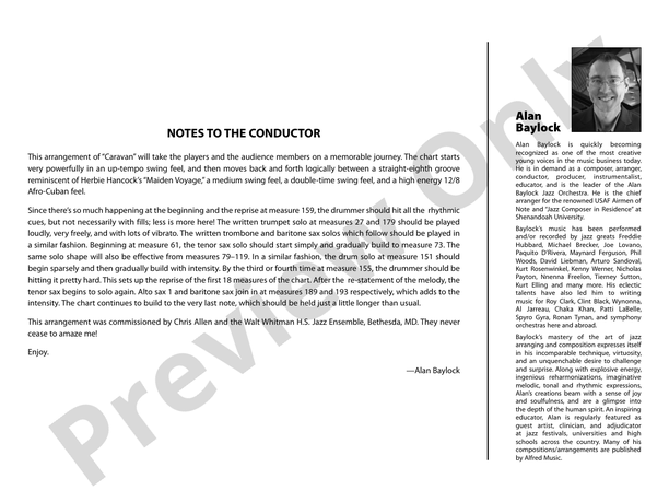 Wow! This is a show-stopping chart by arranger Alan Baylock of the Ellington/Tizol classic. The groove moves logically between an up-tempo swing, a "Maiden Voyage" feel, a double time swing and a 12/8 Afro-Cuban feel. Features include plenty of solo space for tenor saxophone, brief written melody lines for various instruments, and lots of moving lines and sax solis. Lead trumpet range is to written D above the staff. Caravan is nothing short of spectacular.