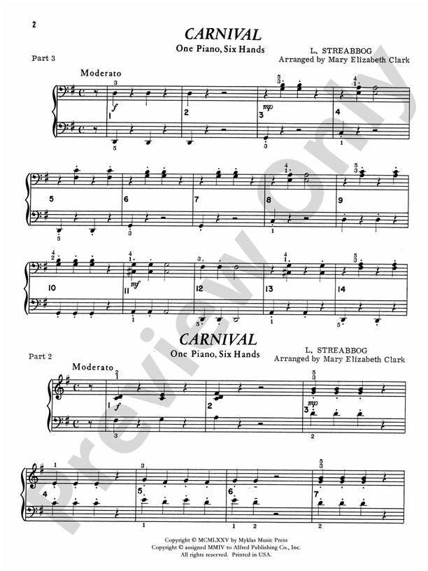 Get in a festive mood with this early intermediate piano trio for one piano, six hands! In the key of G major and common time, Part 1 carries the melody throughout while Parts 2 and 3 keep the steady accompaniment. A Federation Festivals 2024-2028 selection.