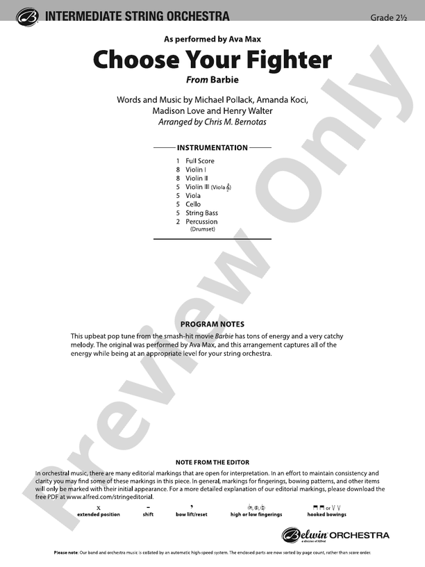This upbeat pop tune from the smash-hit movie Barbie has tons of energy and a catchy melody. The original version of Choose Your Fighter was performed by Ava Max, and this arrangement, by Chris M. Bernotas, captures all of the energy while being at an appropriate level for your string orchestra. (2:20)