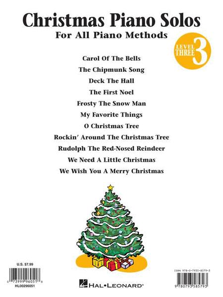 A superb collection of treasured Christmas classics, sure to please the progressing student! Correlated with Hal Leonard Student Piano Library Piano Lessons Book 3, these arrangements are also a perfect supplementary choice for all methods. Includes both stand-alone solos, and student solos with teacher accompaniments. 11 songs: Carol of the Bells * The Chipmunk Song * Deck the Hall * The First Noel * Frosty the Snow Man * My Favorite Things * O Christmas Tree * Rockin' Around the Christmas Tree * Rudolph the Red-Nosed Reindeer * We Need a Little Christmas * We Wish You a Merry Christmas. Level: Late Elementary. Notation includes all note values and rests, including eighths/dotted-eighths; 3/4, 4/4 and Cut Time; swing eighths; simple pedaling; intervals through a 6th; three-note chords; 5-finger patterns, hands-together playing within 5-finger patterns; limited movement around the keyboard via 5-finger-pattern or triad positions; 1st/2nd endings. Reading range: Bass Clef outer Ledger C-Treble Clef outer Ledger C.