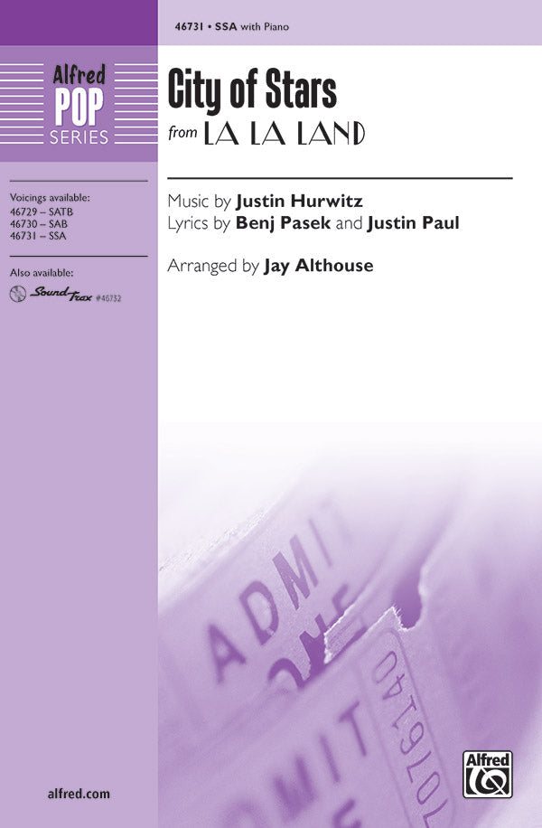 And the Oscar goes to . . . this, the signature song from critically acclaimed and highly awarded La La Land. Winner of Best Original Song at the Academy AwardsÆ, the Golden Globes, and the Critic's Choice Movie Awards, this melancholy yet hopeful ballad features a haunting tune and a distinctive piano accompaniment that are instantly recognizable and extremely well suited for choral groups.