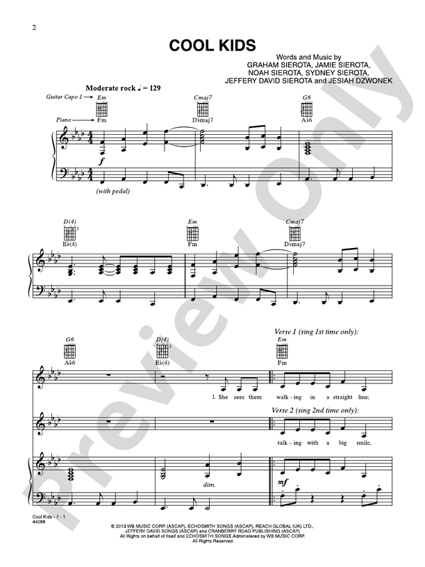 Taken from their debut album, Talking Dreams, "Cool Kids" is Echosmith's catchy yet poignant expression of adolescent alienation. This edition captures the feeling of the recording and features piano accompaniment, lyrics, vocal melody, and guitar chord diagrams.