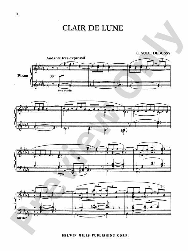 The original, unedited, unsimplified version of one of Debussy's most popular piano works. This ethereal, flowing section of "Suite Bergamasque" is diatonic and displays a conventional harmonic vocabulary in D-flat major. The title, "Clair de lune", suggests a relationship to Paul Verlaine's eponymous poem, describing a vision of long-dead dancers in the moonlight. The music transmits the otherworldly, transparent, and impalpable qualities of the experience while maintaining clarity and definition. Perfect for the burgeoning late intermediate pianist.