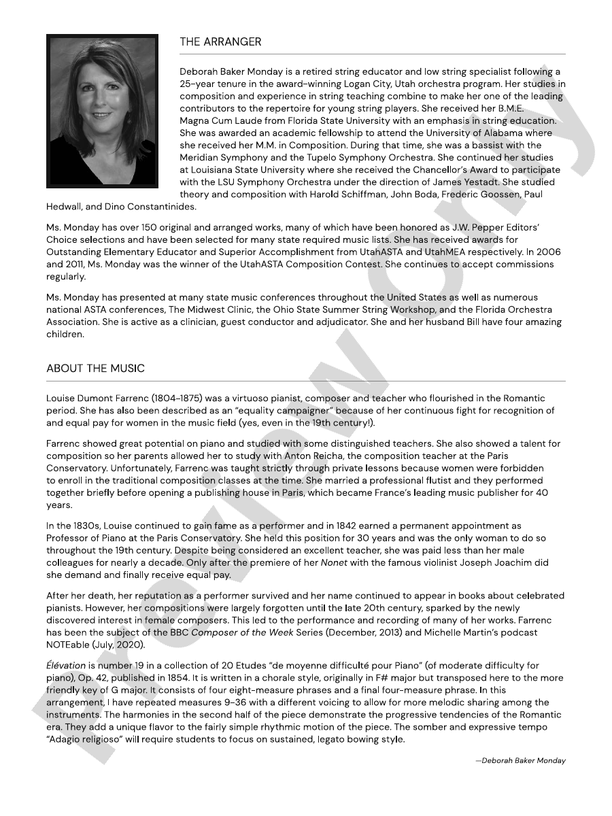 Feature the stunning music of Louise Dumont Farrenc, former professor at the Paris Conservatory. Taken from Farrenc's collection of 20 etudes, this arrangement of *Élévation* is expertly orchestrated by Deborah Baker Monday, who has kept the endearing musical sophistication of the original despite its technical simplicity. A wonderful addition to any program regardless of grade level. (2:15)
