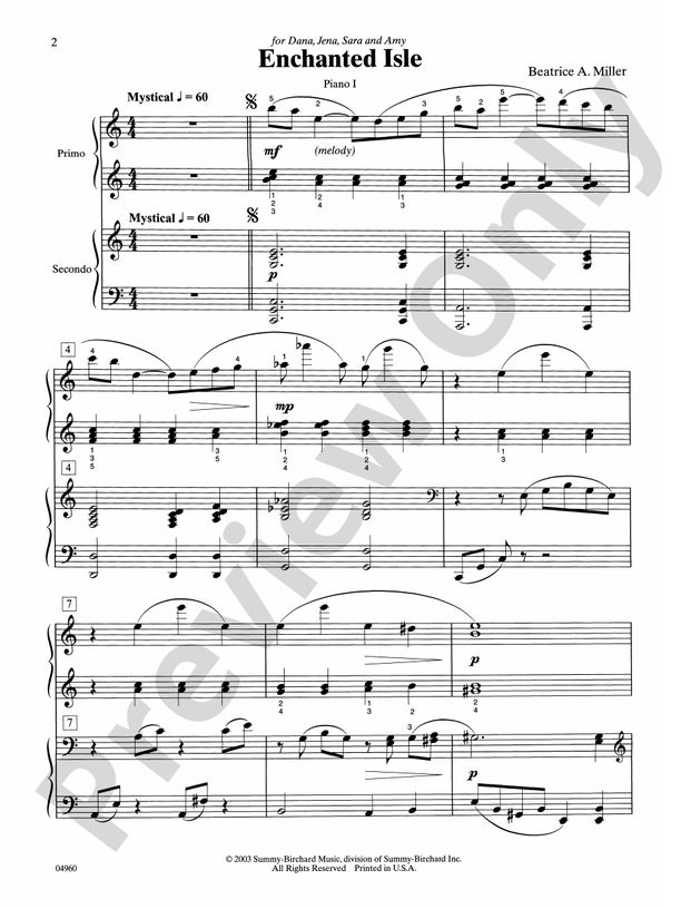 This two pianos, eight hands intermediate quartet utilizes extended harmonies in the key of C to create the mystical setting suggested by the title. Melodies are fluidly interwoven among the parts along with a rhythmically repetitive chordal accompaniment. This piece is a joy to play. Two copies are included. A Federation Festivals 2024-2028 selection.