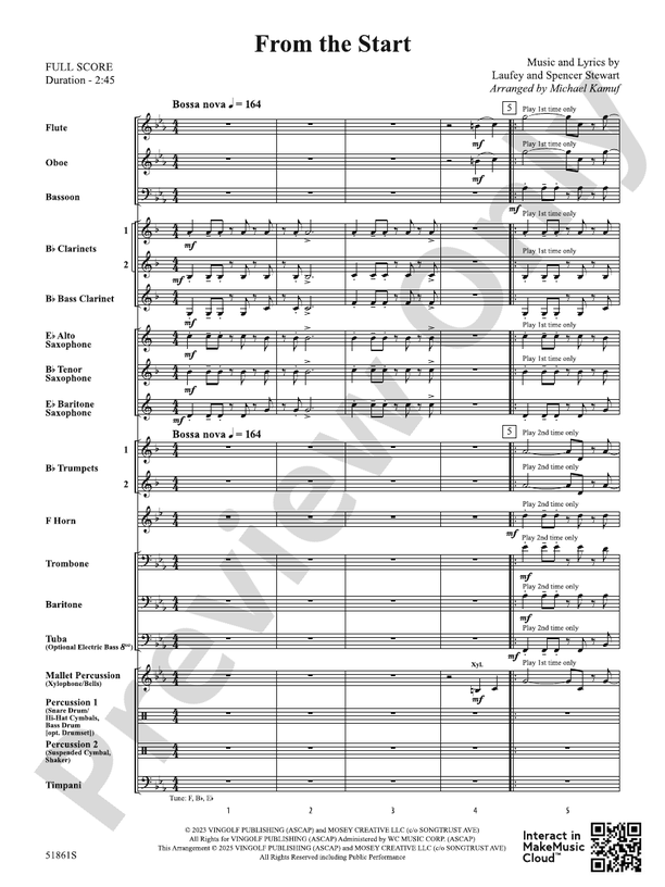 Influenced by a wide range of musical artists ranging from Billie Holiday to Taylor Swift, singer/songwriter Laufey brings together catchy melodies, bossa nova rhythms, and jazz harmonies in her recent hit, From the Start. This arrangement, by Michael Kamuf, reinforces syncopated rhythms and has Laufey's scat-singing solo written for an alto saxophone soloist (cross-cued in trumpet). Your students and audiences will be singing the melodies! (2:45)