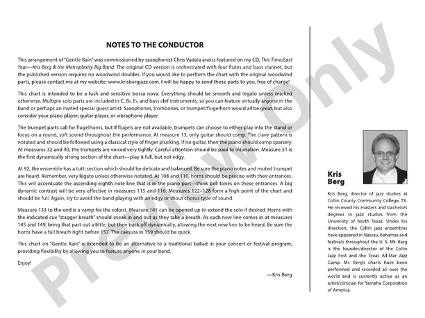 A wonderful tune with a rich texture and voicings. This is a solo vehicle for C, B-flat, E-flat or bass clef instruments with optional parts included for flute or vibes. Bossa nova tempo is 126 BPM and lead trumpet range is to written B above the staff. This chart was also commercially recorded by arranger Kris Berg's Metroplexity Big Band, This Time/Last Year.
