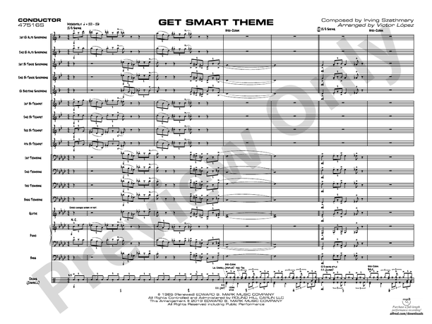 The theme from this classic tongue-in-cheek television show is played with an Afro-Cuban groove alternating with a 12/8 swing around 120 BPM. Other features include written-out sample solos for alto 1 and trumpet, and a lead trumpet range to written A above the staff. It's powerful, exciting, and a potential show-stopper. (4:01)