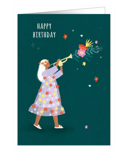 Greeting Card a Girl Playing the Trumpet with Flowers Happy Birthday