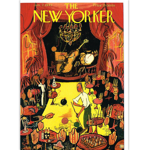 Greeting Card - The New Yorker magazine cover by Ludwig Bemelmans. This is the scene at the end of a night at a Jazz Club. The instruments are on the stage without the musicians & two men are cleaning up. International Card Company publishing.