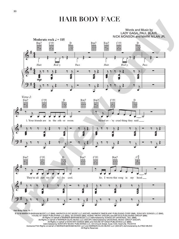 Composer: Lady Gaga,Mark Nilan, Jr.,Nick Monson,Paul BlairArranger: Instrumentation: Grade: Publisher: Alfred MusicPage Count: 8Format: Digital PDF