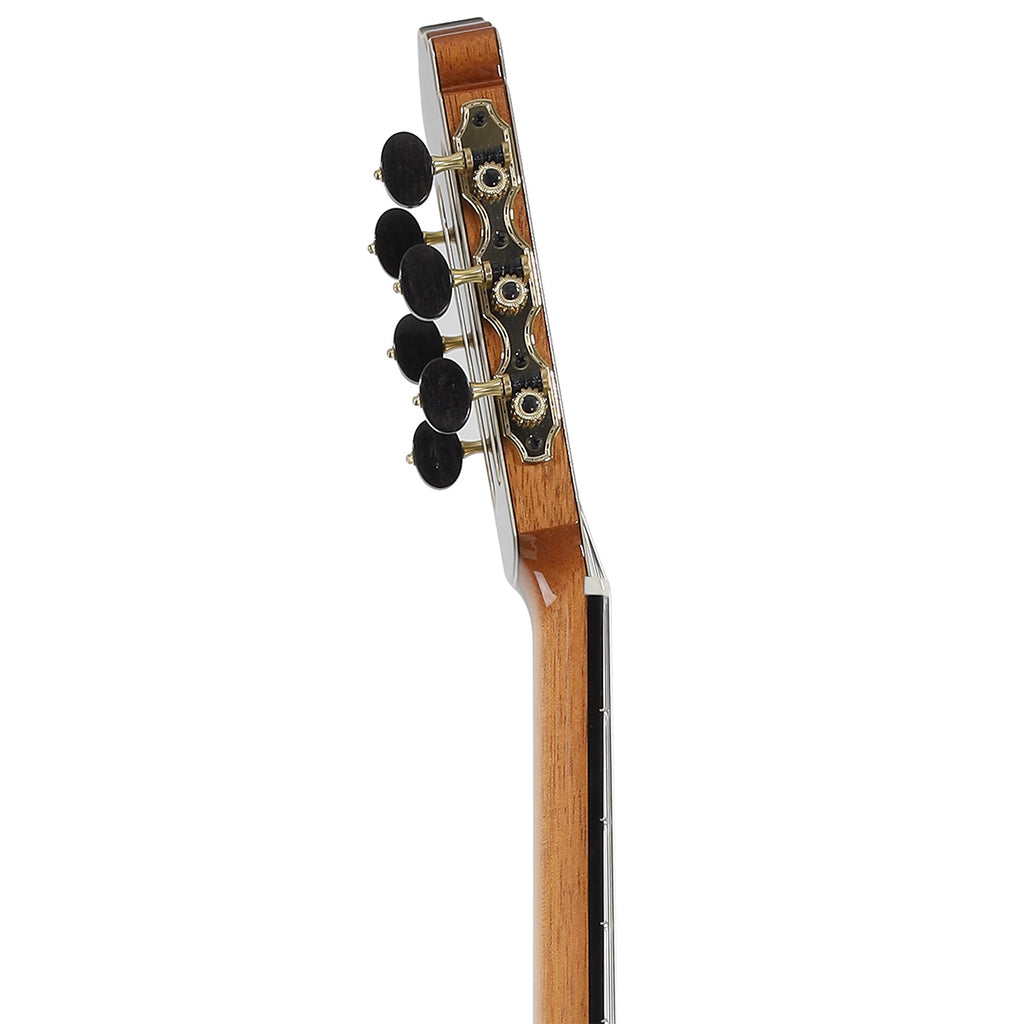 Made from solid tonewoods, this guitar comes with high-quality Teflon-mounted ‘Rubner Gold Tuning Machines’ and bushed holes. Other quality features include the cedro neck that has been laminated throughout with hardwood, the African blackwood fretboard and bridge saddle made from hard bone material. The asymmetrical HANIKA fan bracing in spruce is responsible for best sound and stability here.