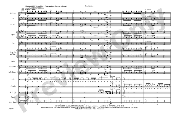 We are pleased to present a complete halftime show based on the unforgettable music from the Harry Potter series of movies. Arranged by veteran writer Victor López, Part 1 begins with the iconic "Another Story" (Hedwig's Theme), then moves into the familiar "Nimbus 2000," before finishing with "Dumbledore's Army." The innovative, colorful scoring will engage your band and audience alike!For educational usage/non-profit performances only; for professional arrangements, visit our rental library at https://www.alfred.com/rental.