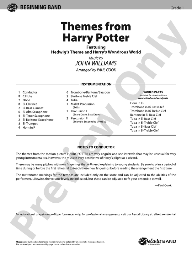 Two of the most memorable themes from the box office smash *Harry Potter and the Sorcerer's Stone* are scored for beginning band. The colorful textures and flowing melodies remain intact and the themes are presented in two separate movements so that endurance is guaranteed. "Harry's Wonderous World" and "Hedwig's Theme" will certainly conjure up a great performance. (2:11)