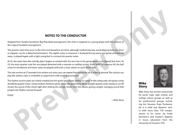 So you want to play Gordon Goodwin charts but they're way too challenging for young players, well, problem solved. Check out Mike Story's adaptation of this swingin' Big Phat Band hit---it's still hip, it still has all the Goodwin ingredients, yet it's very accessible. Written-out solos available for alto, tenor, trumpet and trombone, trumpet 1 range is to written E, top space. This chart deserves a big spot in your program!