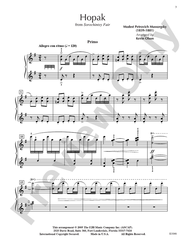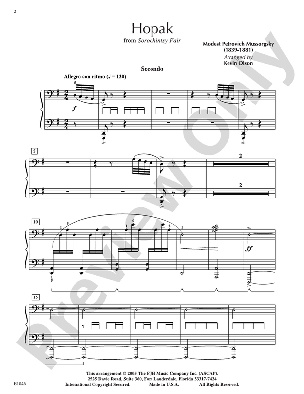 The excitement of this brilliant orchestral favorite by Mussorgsky has been skillfully recreated in this piano duet by Kevin Olson. For you musicologists, a hopak is a strongly rhythmic Ukranian folk song in duple meter. A great way to end a recital program!.