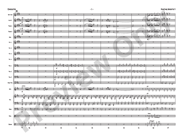 Whoa, this is the next Hunting Wabbits chart in the "trilogy." As recorded by the Big Phat Band on the Goodwin CD That's How We Roll, this HW3 is fairly challenging, but well worth the effort. There are parts for soprano sax lead (alternate alto 1) and 2nd alto with piccolo (alternate 2nd alto sax-only) and solo space for soprano (alto), alto, tenor 1, trumpet 4, and trombone 1. Lead trumpet range is to written high F-sharp.