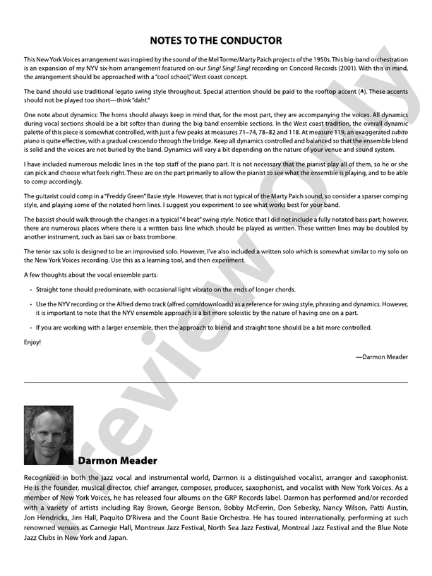 Jazz vocal quartets/groups are happening! Feature a soloist, vocal quartet or SATB choir with your jazz ensemble! A medium-swing arrangement by Darmon Meader, the musical director and chief arranger of the sensational jazz vocal group, New York Voices, this was arranged for the New York Voices with jazz ensemble. The solo vocal range is from G below middle C up to F top line, treble clef. Lead trumpet range is to high D above the staff. This chart includes the jazz band arrangement, four copies of the SATB part and an optional arrangement for vocal soloist. To perform with a choir, purchase additional SATB parts (item number 00-31002). (4:10)