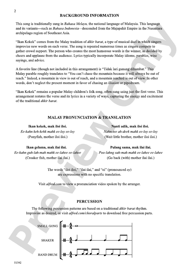 This Malaysian folk song comes from the tradition of dikir barat, an improvisatory musical duel. Jerry Lim's fast-paced arrangement develops the pentatonic theme in a variety of ways, including sung in canon, stacked in thirds, and paired with a tuneful counterline. Downloadable parts for a small gong, shaker, and hand drum enhance the style, and a Malay pronunciation/translation guide is included in the publication.