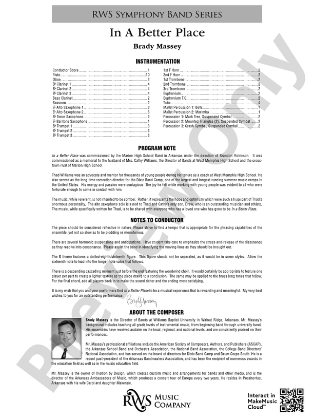 Written as an homage to one who shared their love of music and music education to countless thousands of students, this lyrical work inspires hope, and optimism. Beautiful melodies move throughout the ensemble to showcase expressiveness and musicality of all players. "In A Better Place" is a reverent celebration of life and music.